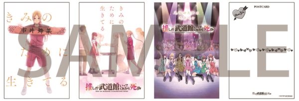 TVアニメ「推しが武道館いってくれたら死ぬ」Blu-ray Vol.1を下記の対象法人にてご予約・ご購入のお客様に先着で「ポストカード3枚セット」をプレゼント致します!予約期日までにご予約いただきますと確実に差し上げます。以降のご予約・ご購入に関しましては先着特典となります。各店数量がなくなり次第終了となりますので、ご予約はお早めに!